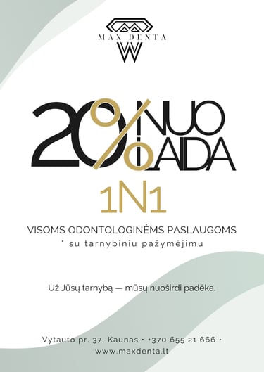 „1N1“ sporto klubo bendruomenei taikome 20 % nuolaidą visoms odontologinėms paslaugoms klinikoje „Maxdenta“.