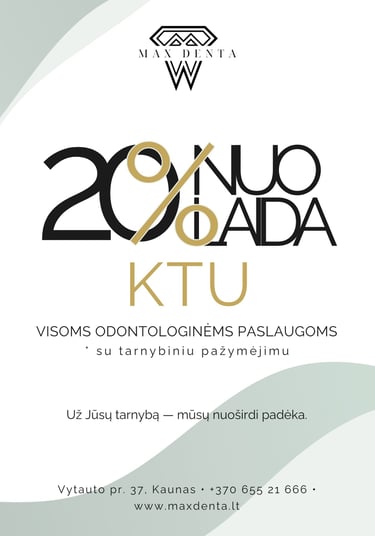 If you are looking for a reliable dental clinic for the KTU community in Kaunas, “Maxdenta” offers a 20% discount on all dental services for students, lecturers, and staff of Kaunas University of Technology.