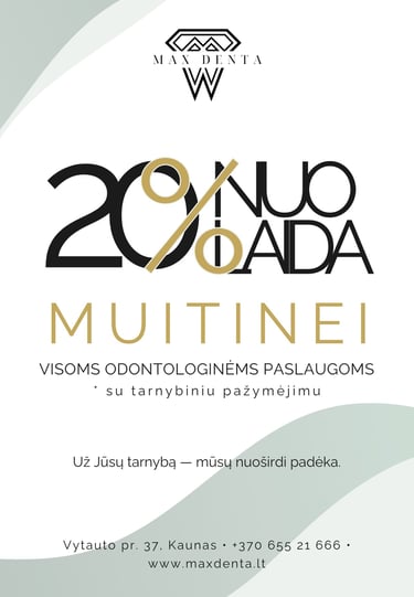 Jeigu ieškote patikimos odontologijos klinikos muitinės pareigūnams Kaune, „Maxdenta“ siūlo 20 % nuolaidą visoms odontologinėms paslaugoms muitinės sistemoje dirbantiems pareigūnams, darbuotojams ir jų šeimos nariams.